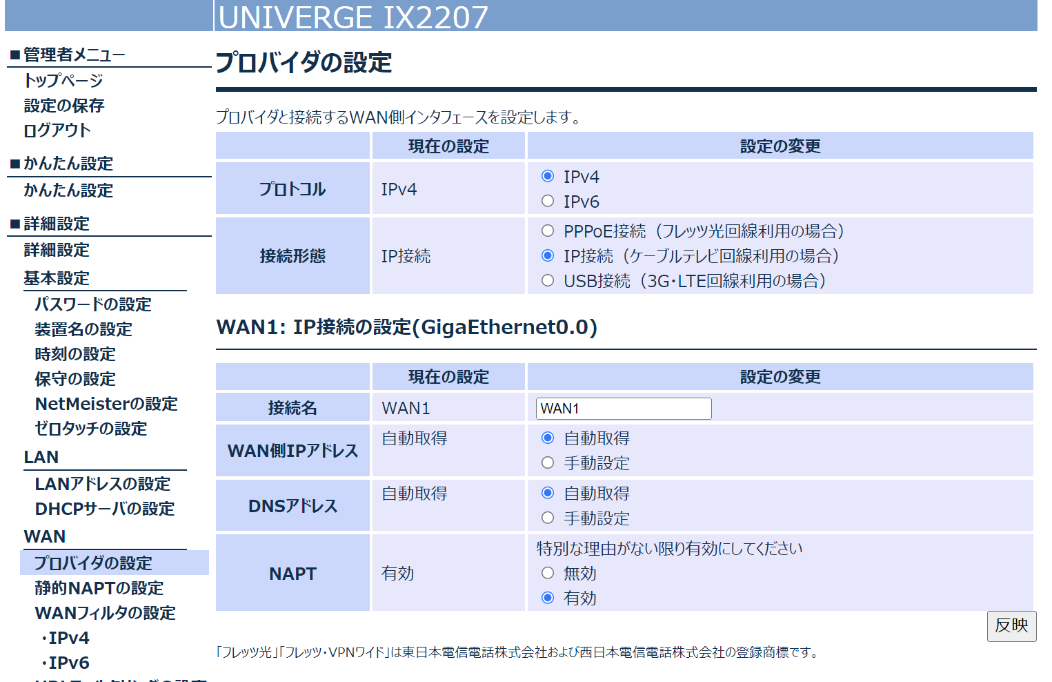 そのため、IP 接続とし WAN 側 IP アドレスは自動取得で設定しています。